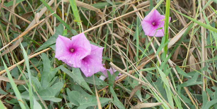 Close-up of pink and white Convolvulus arvensis wildflowers with copy space image.