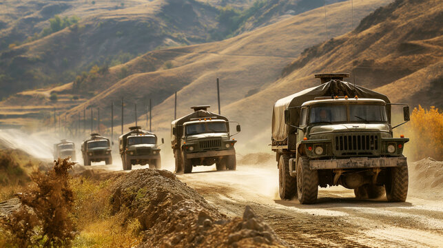 Military vehicles on the road in arid landscape, showcasing mobility and force, Military vehicles convey strategic importance. These Military vehicles symbolize strength in challenging terrain.