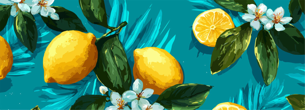 鮮やかなターコイズの背景に、瑞々しいレモンと可憐な白い花、生き生きとした緑の葉が美しく配置された、夏らしい爽やかな雰囲気のシームレスなベクターパターンデザイン。
