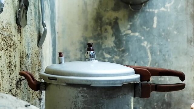 An Old alumunium pressure cooker with worn handles placed in a rustic kitchen, showing vintage cooking equipment against a weathered textured wall background