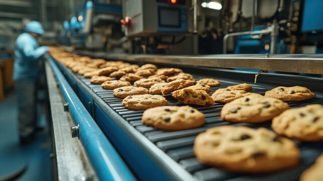 Sweet factory, A high-quality image of a conveyor belt filled with freshly baked cookies, showcasing delicious treats ready for packaging and distribution.