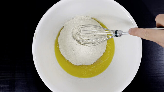 Flour added to melted butter in white mixing bowl with whisk, hand holding utensil on black table background during cookie dough preparation process