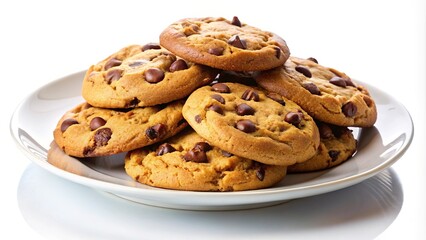 Chocolate chip cookies on a white plate isolated on white background with shallow depth of field