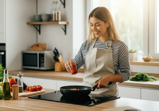 Woman encouraged to clean refrigerator while cooking in contemporary kitchen