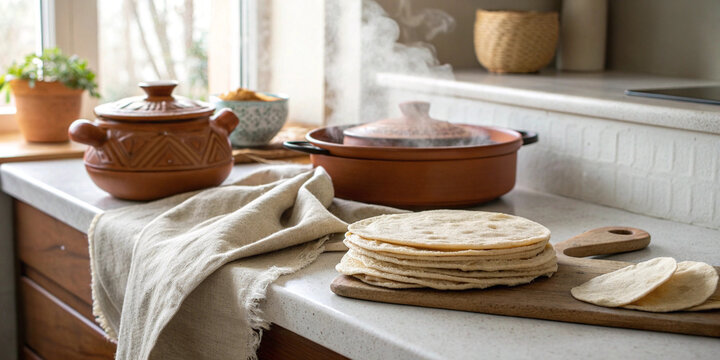 Rustic kitchen with steaming mexican clay pots fresh tortillas wooden utensils and ceramic items suitable for culinary heritage visuals traditional food restaurant branding and packaging templates