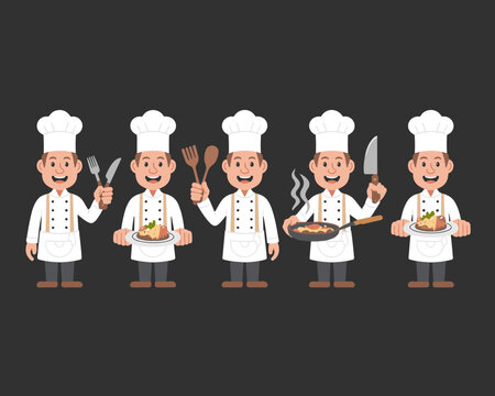 Cartoon chef character set holding kitchen utensils and food preparation culinary arts concept for restaurant menu design food industry advertising professional cooking class presentation healthy eati