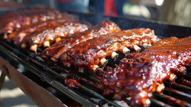 A BBQ competition showcasing various styles of pork ribs, from Memphis dry rub to Kansas City sauce.