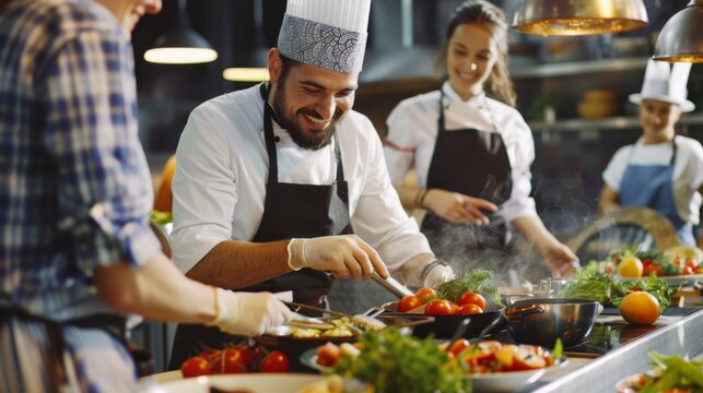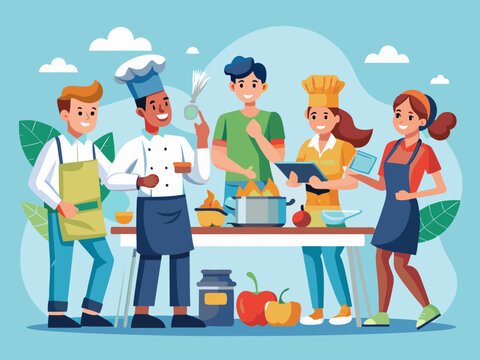 A group of amateur chefs cooking up innovative and unconventional dishes in a cooking competition beat out professional chefs with Michelinstarred. Vector illustration
