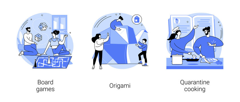 Social isolation free time abstract concept vector illustration set. Board games, origami, quarantine cooking family fun activity idea, family recipe, homemade food, stay at home abstract metaphor.