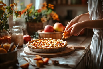 Cozy autumn kitchen where a person bakes a fresh apple pie with seasonal ingredients and decor