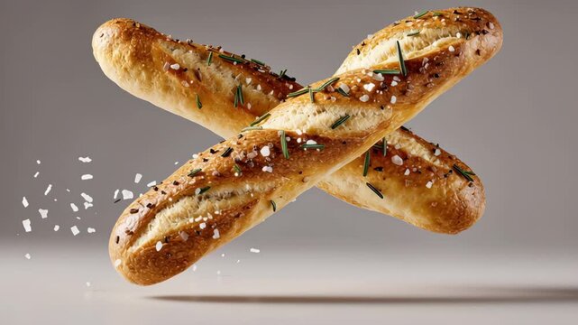 Freshly baked pretzel sticks in mid-air with scattered sea salt and herbs, showcasing dynamic movement and texture in a visually appealing culinary presentation for food enthusiasts and chefs