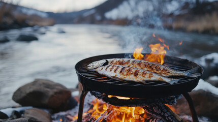 Two fish grill over an open flame near a river surrounded by mountains on a cool afternoon, showcasing a delightful outdoors cooking experience