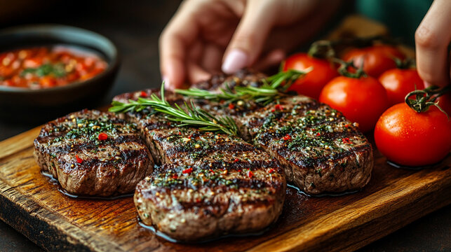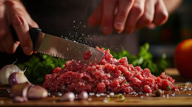 Freshly minced meat being prepared on a wooden board, showcasing a vibrant kitchen atmosphere and cooking process.
