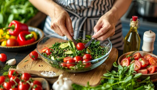 female chef's hand delicately placing a garnish on a dish, highlighting precision and artistry in food presentation. The image symbolizes creativity, care, and passion in culinary craftsmanship