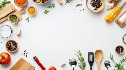 Flat lay of various cooking ingredients and utensils arranged on white background, creating a frame with copy space in the center.