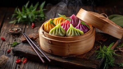 A bamboo basket holds vibrant dumplings in shades of purple, green, orange, and pink, releasing steam into the air. Fresh herbs and spices surround the dish, creating an inviting atmosphere