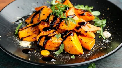 Grilled sweet potatoes drizzled with balsamic reduction served on a black plate with fresh herbs