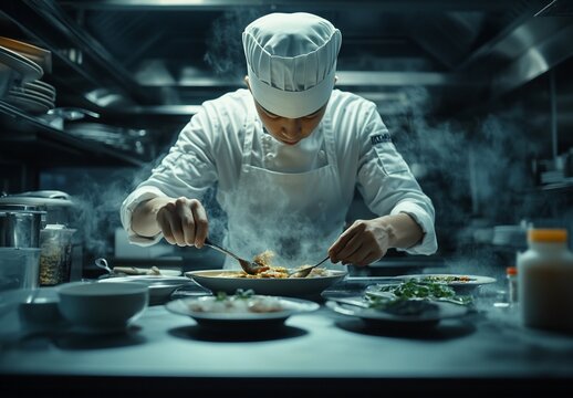 Chef meticulously prepares a steaming dish in a professional kitchen.