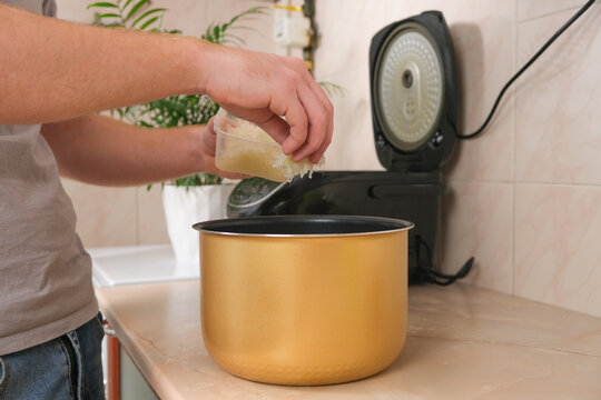 The man puts the frozen grated onion with juice into bowl of slow cooker. multicooker. Cooking lunch dinner for family at home. The process of cooking meat in French with potatoes, tomatoes, cheese.