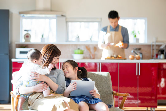 Interested woman look into laptop screen, choosing film, program, movie, video to watch while cooking in kitchen. asian female reading food recipes in internet, surfing in social networks, web pages
