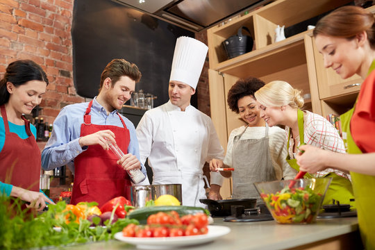 Group of schoolgirls having fun learning to cook. Female students in a cooking class.