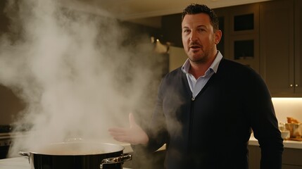 Man cooking steaming pot, modern kitchen, culinary show, food demonstration