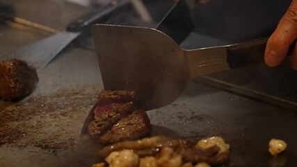 The chef prepares food in front of the visitors in the restaurant