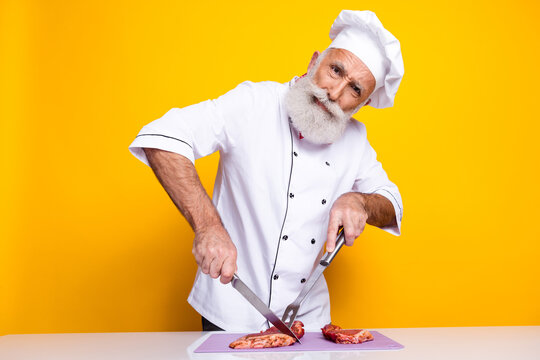 Senior chef in uniform preparing meat dish in a vibrant yellow setting, showcasing cooking skills