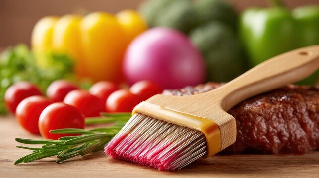 A close-up of a meat marinade brush with vibrant vegetables in the background, emphasizing freshness and trust
