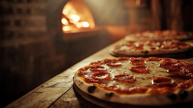 Sizzling hot pizzas straight from the oven, captured in stunning 4K Ultra HD. They rest on a rustic wooden table, tantalizingly close.