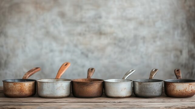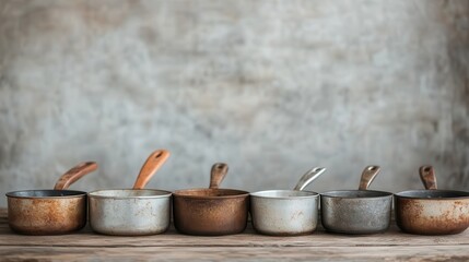 A series of six aged and rustic pots are neatly arranged in a row on a wooden shelf, showcasing their unique handles and worn surfaces against a neutral backdrop.
