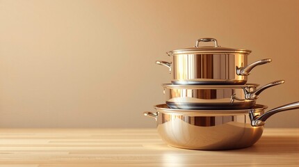 Collection of different sized cooking pots and pans arranged in a decorative arc, ideal for culinary websites or kitchenware promotions