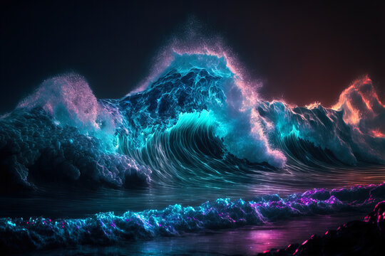 Night fantasy seascape with futuristic waves and foam. Neon foam on water waves. Digital artwork