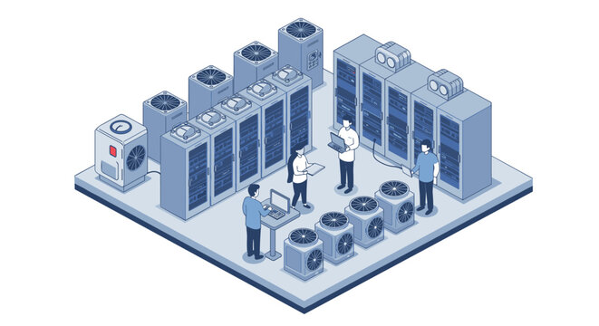 Isometric data center with cooling units and technicians in blue tones