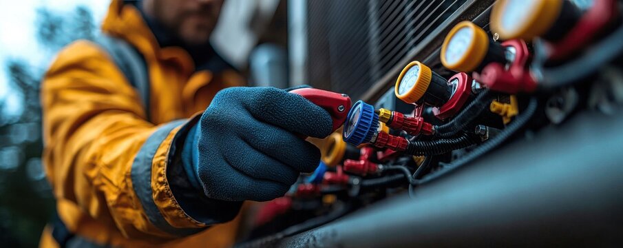 Technician inspecting air conditioning units with professional tools and gauges