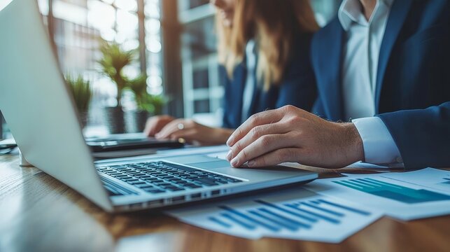Two professionals discussing a project on a laptop in a modern office. Great for teamwork, leadership, and business themes.