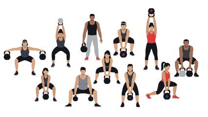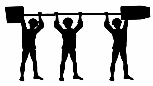 Three silhouetted figures lifting a heavy barbell overhead in a coordinated weightlifting exercise pose | editable eps vectors