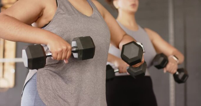 Female workout partners gripping hex dumbbells while performing upright rows in gym for strength