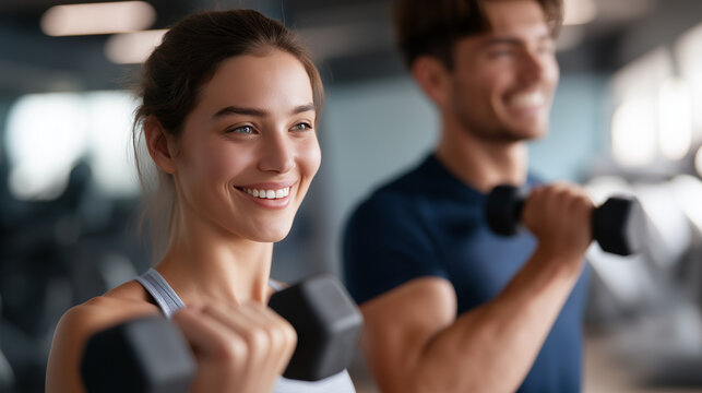 Faceless happy athletic couple exercising with hand weights heavily defocused gym background anonymous partners in lunge position fitness strength training coordinated workout