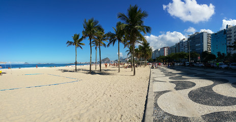 View of Copacabana beach with its famous mosaic on the boardwalk and coconut trees in summer day