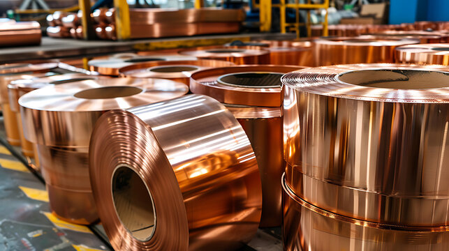 Copper coils stacked neatly in a manufacturing facility, reflecting warm light, showcasing their shiny, metallic surface and industrial setting.