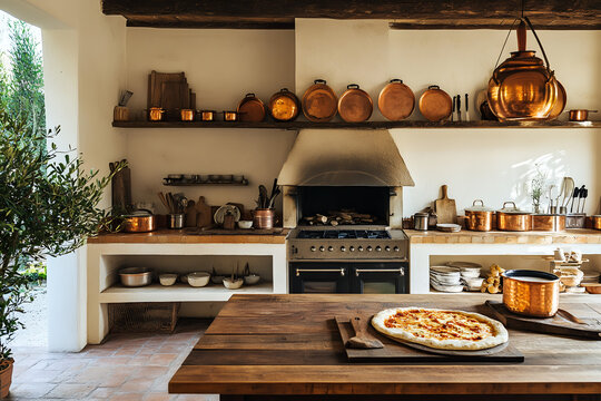A rustic Italian kitchen with a wood-fired pizza oven and copper pots.