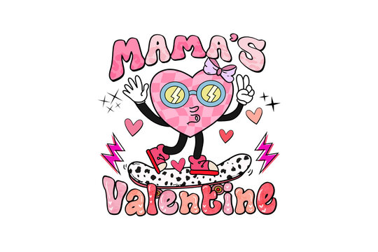 Mamas Valentine, Retro groovy heart character on skateboard illustration Sublimation Design