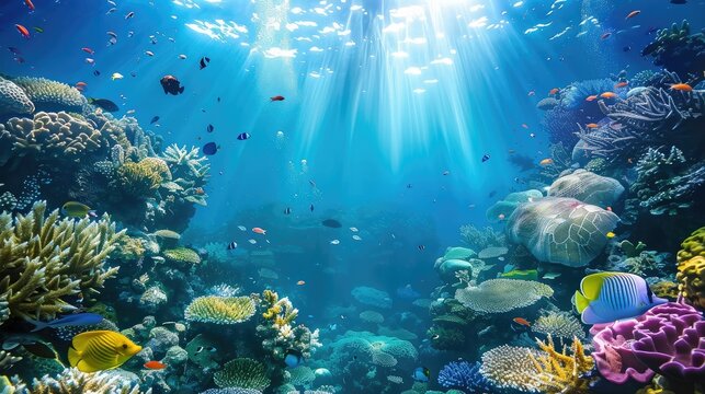 Blue ocean underwater world with beautiful sunlight shining. Blue Water Tropical Reef. Tropical underwater sea fish. Colorful tropical coral reef. Scene reef. Marine life sea world. Underwater fish re