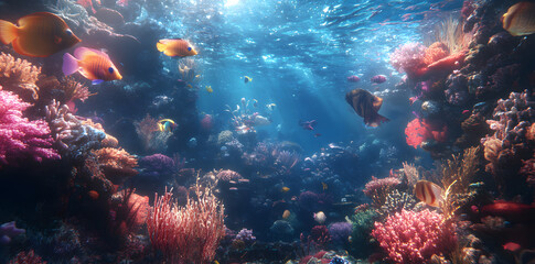 Underwater view of a vast coral reef with blue-hued, eco-friendly machinery designed to monitor and protect ocean life, surrounded by vibrant fish species