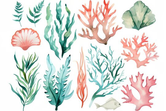 Watercolor sea coral and seaweed clipart. Hand drawn watercolor sea themed elements. Illustration isolated on white background