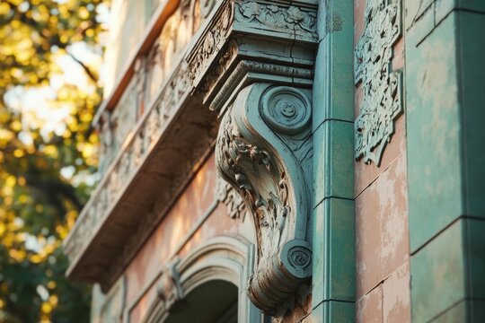 Ornate architectural detail with a scrolled corbel and decorative elements on the facade of a building, creating an artistic composition.