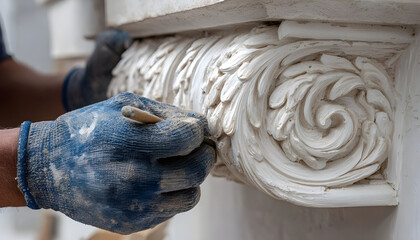 Extreme close-up of a gloved hand meticulously painting an ornate plaster molding corbel with a brush, framed by wooden beams, illustrating detailed architectural restoration and craftsmanship concept