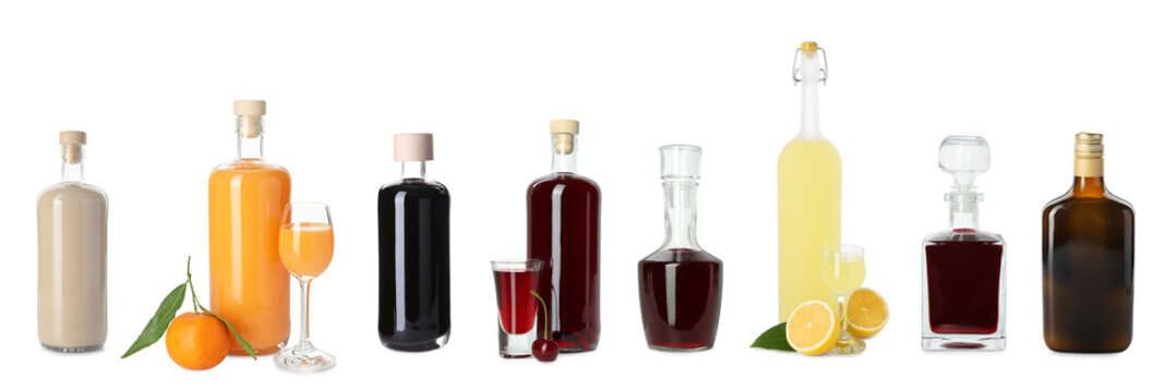 Collection of different tasty liqueurs on white background