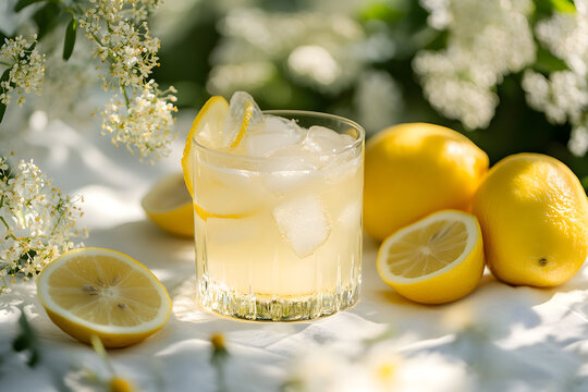 Refreshing glass of elderflower cordial with ice cubes and lemon slices for a perfect summer drink.
